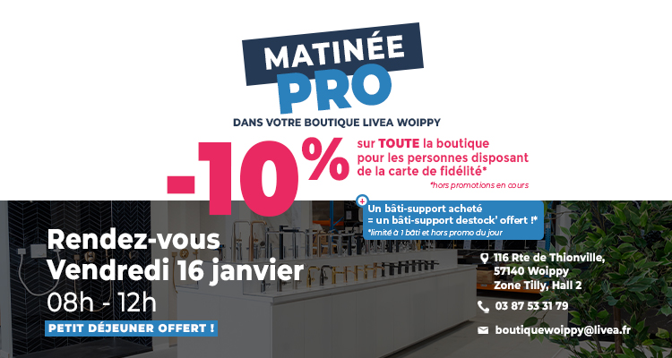 Pour bien dĂ©marrer l’annĂ©e, la boutique Livea Woippy, votre magasin sanitaire de rĂ©fĂ©rence prĂšs de Metz, organise sa MatinĂ©e des pros[RL1]  : un rendez-vous convivial pensĂ© spĂ©cialement pour les artisans, plombiers, installateurs, carreleurs et professionnels du bĂątiment.